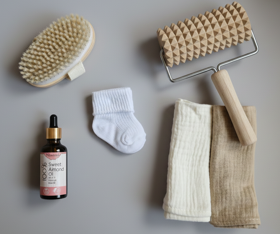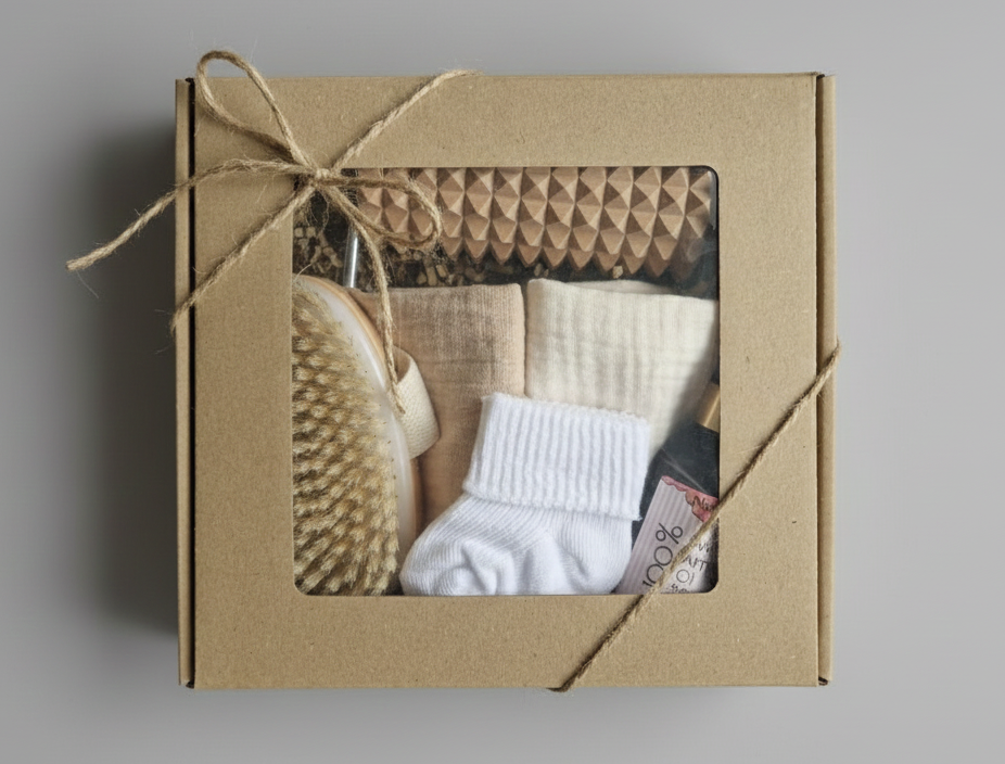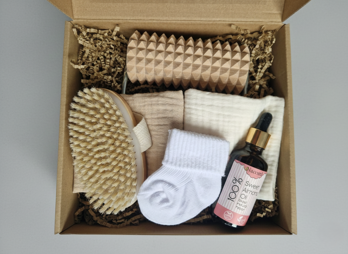 Pięknie zapakowany i wykonany z troską, zestaw MamyBobasy zawiera niezbędne akcesoria dla mam i niemowląt. Znajdziesz w nim: masażer, suchą szczotkę do ciała, olej ze słodkich migdałów, pieluszki muślinowe x2, skarpetki dla maluszka. Wymiary pudełka 20x20x5cm.